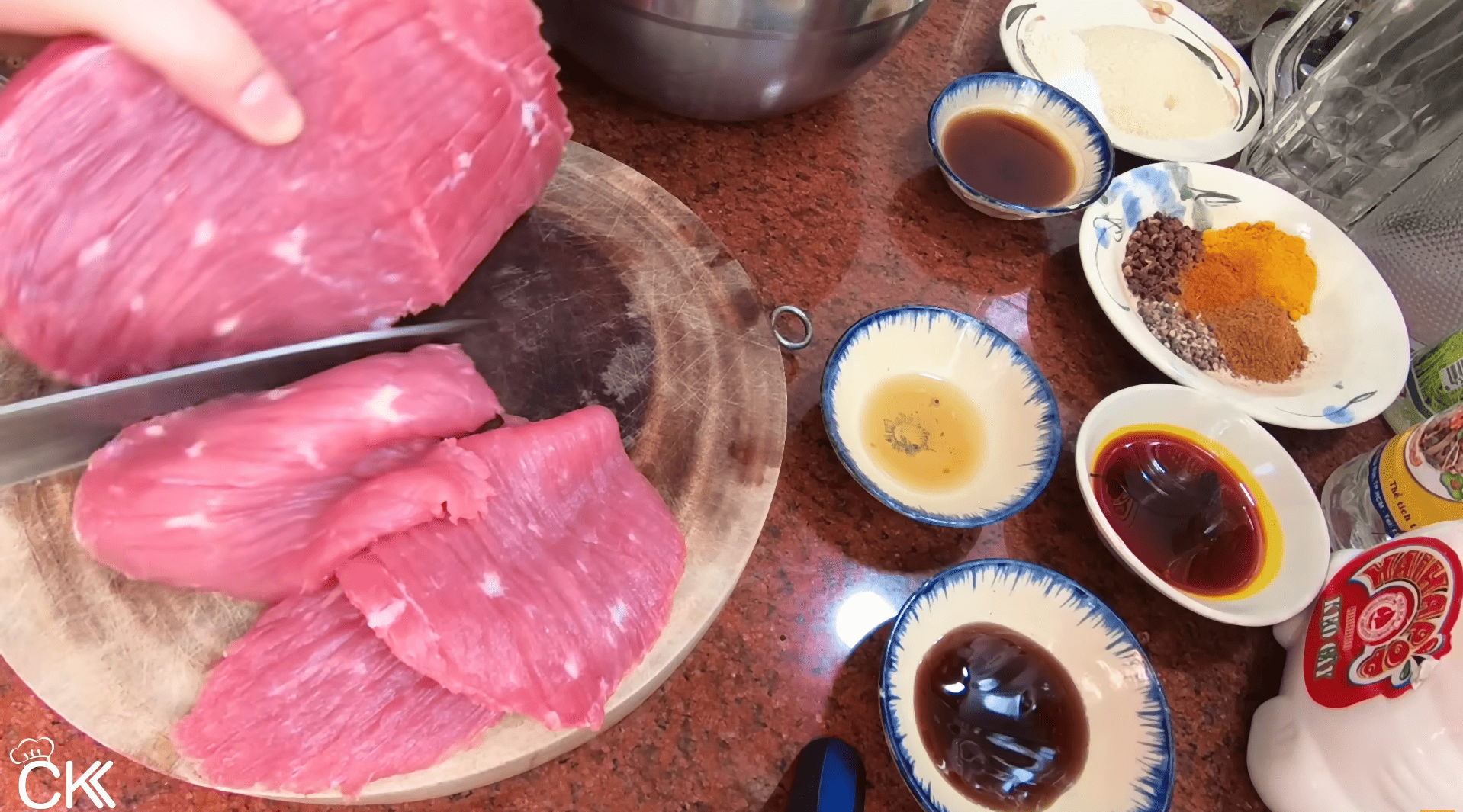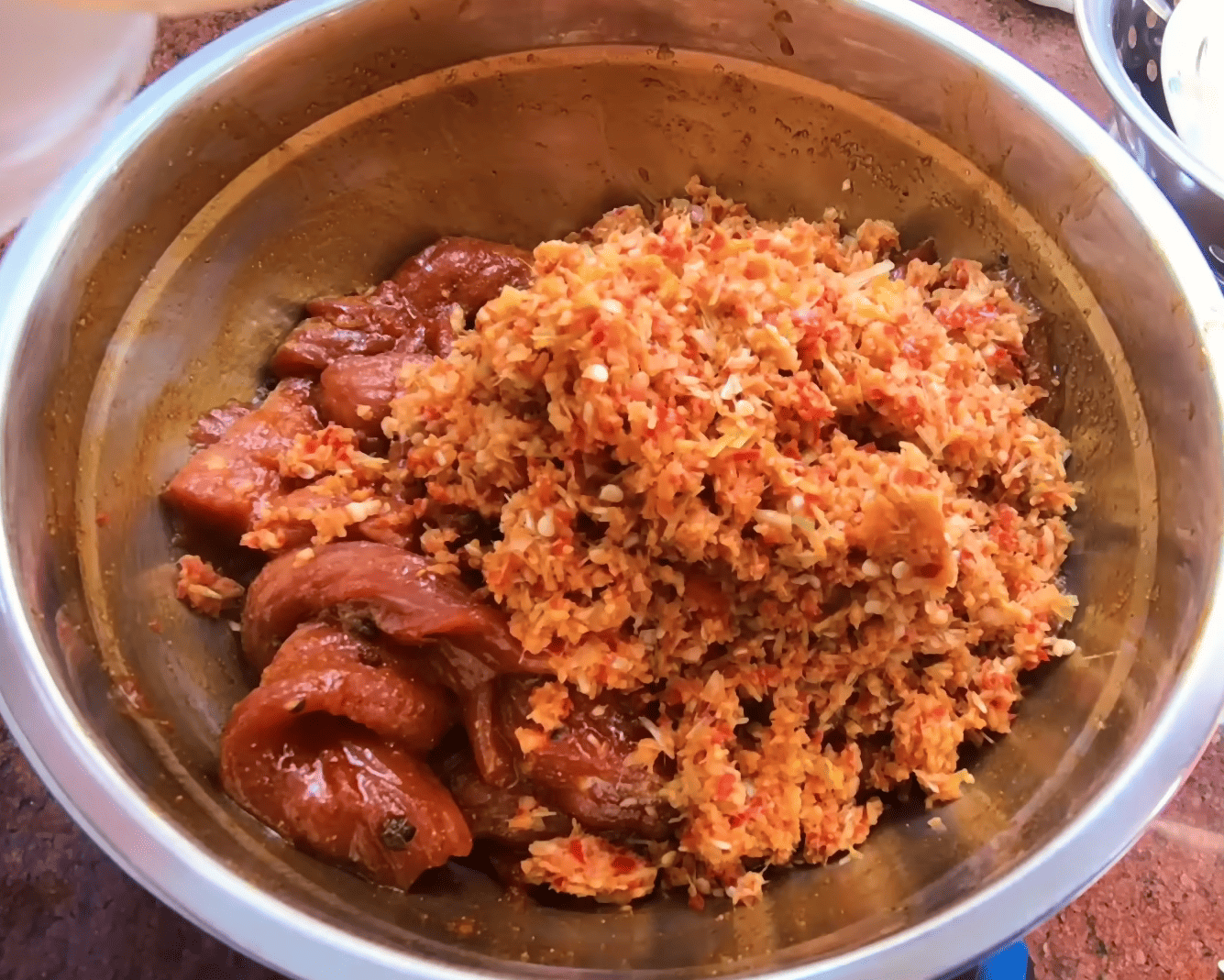 Gia vị nước (nước mắm, dầu điều, mật ong/đường) được cho vào trước, trộn đều từng lát thịt. Sau đó là: