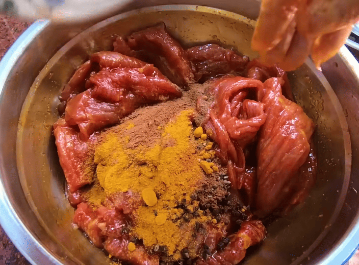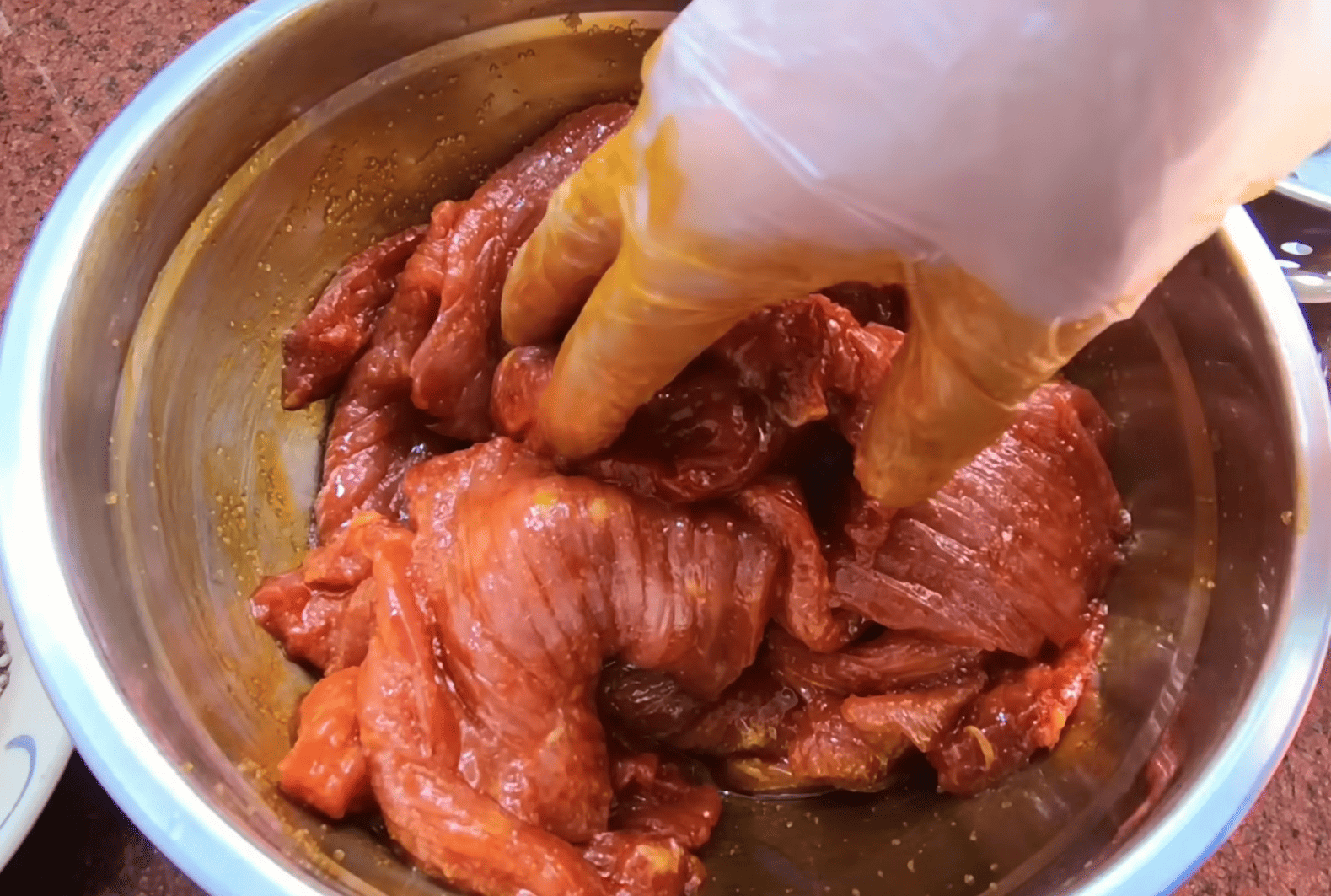 Thịt được bóp nhẹ bằng tay (có bao tay), không vò mạnh để không làm nát thớ. Ướp ít nhất 1–2 tiếng, hoặc để qua đêm trong ngăn mát.